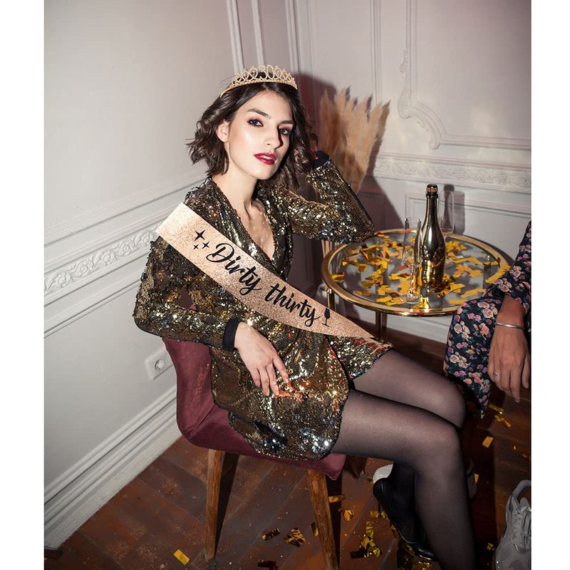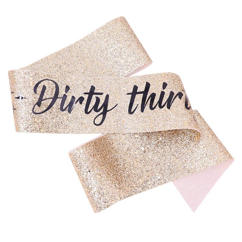 - Dirty Thirty Sash: Soft glitter fabric sash with hot pressed stamping foil lettering for a stylish birthday accessory