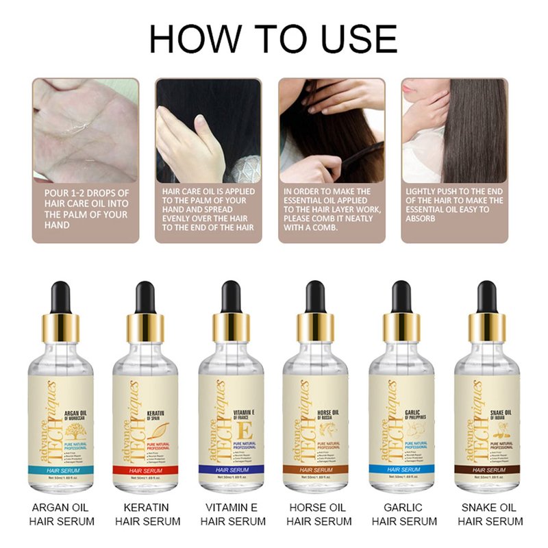 1.Vitamin E oil Hair serum from France. Benefits Helps In Hair Health. The antioxidant property of vitamin E reduces this cell damage and improves hair growth. Prevents Hair Loss. One study found out that vitamin E prevents hair loss, hair breakage and split ends. Contributes To Hair Shine. Balances Oil On The Scalp. 2.Argan Oil Hair from Moroccan serum 500ml Benefits Argan oil is good for your hair because it contains essential oils and fatty acids that are incredibly restorative to dry, damaged hair. Not only does it repair damaged hair, it helps to maintain healthy hair by keeping it supple, soft, and well-nourished. Heat from styling, salt from sweat, UV rays from sunlight. 3.Garlic oil Hair serum from Philippines Benefits The presence of selenium content in garlic helps boost blood circulation for maximum nourishment. It also helps cleanse hair follicles, strengthens them and prevents clogging, further curbing hair loss. Garlic helps calm aggravated scalp and treats issues like dandruff. 4.Keratin oil Hair serum from Spain Benefits Keratin Serum helps nourish your hair, repair past damage and protect against future damage. It contains Argan, Wheat Germ and Vitamin E oils, which work together to moisturize dry hair and bring back its gloss, softness and shine. 5.Snake oil Hair serum from India Benefits In addition to protecting hair from the air, snake oil is ideal to fight against hair loss, dandruff and greatly helps the capillary growth. Snail oil fortifies the hair and restores the thickness of the hair too fine. It deeply rehydrates the hair 6.Horse oil Hair serum from Russia Benefits Now one of the top selling beauty products in Japan, Hong Kong, Taiwan, and mainland China, horse oil is used to improve skin elasticity, wrinkles, acne, sunburn, and eczema. It also keeps the skin moisturized and balances tone.