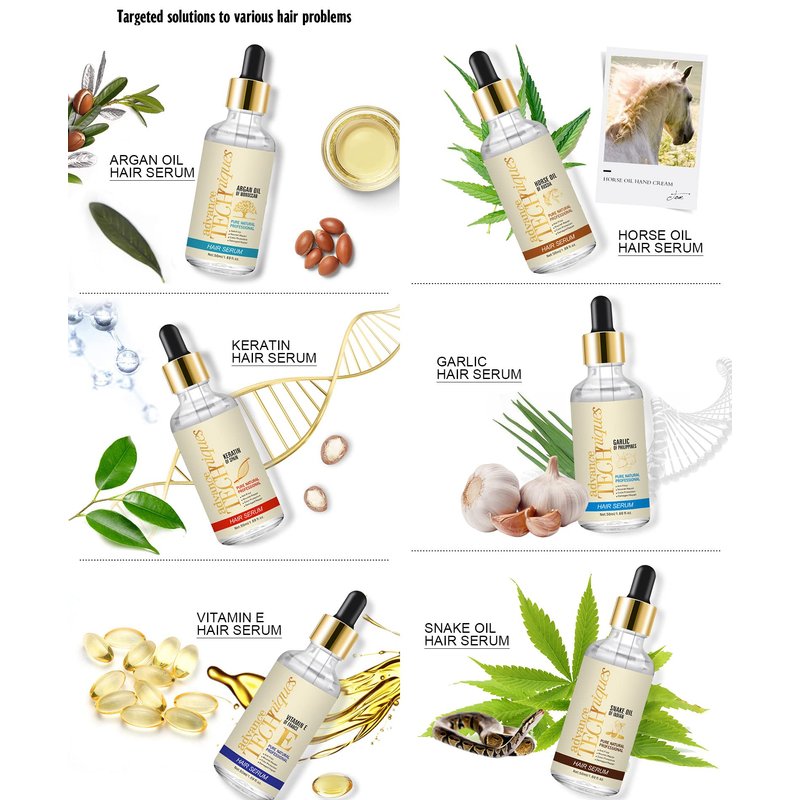 1.Vitamin E oil Hair serum from France. Benefits Helps In Hair Health. The antioxidant property of vitamin E reduces this cell damage and improves hair growth. Prevents Hair Loss. One study found out that vitamin E prevents hair loss, hair breakage and split ends. Contributes To Hair Shine. Balances Oil On The Scalp. 2.Argan Oil Hair from Moroccan serum 500ml Benefits Argan oil is good for your hair because it contains essential oils and fatty acids that are incredibly restorative to dry, damaged hair. Not only does it repair damaged hair, it helps to maintain healthy hair by keeping it supple, soft, and well-nourished. Heat from styling, salt from sweat, UV rays from sunlight. 3.Garlic oil Hair serum from Philippines Benefits The presence of selenium content in garlic helps boost blood circulation for maximum nourishment. It also helps cleanse hair follicles, strengthens them and prevents clogging, further curbing hair loss. Garlic helps calm aggravated scalp and treats issues like dandruff. 4.Keratin oil Hair serum from Spain Benefits Keratin Serum helps nourish your hair, repair past damage and protect against future damage. It contains Argan, Wheat Germ and Vitamin E oils, which work together to moisturize dry hair and bring back its gloss, softness and shine. 5.Snake oil Hair serum from India Benefits In addition to protecting hair from the air, snake oil is ideal to fight against hair loss, dandruff and greatly helps the capillary growth. Snail oil fortifies the hair and restores the thickness of the hair too fine. It deeply rehydrates the hair 6.Horse oil Hair serum from Russia Benefits Now one of the top selling beauty products in Japan, Hong Kong, Taiwan, and mainland China, horse oil is used to improve skin elasticity, wrinkles, acne, sunburn, and eczema. It also keeps the skin moisturized and balances tone.