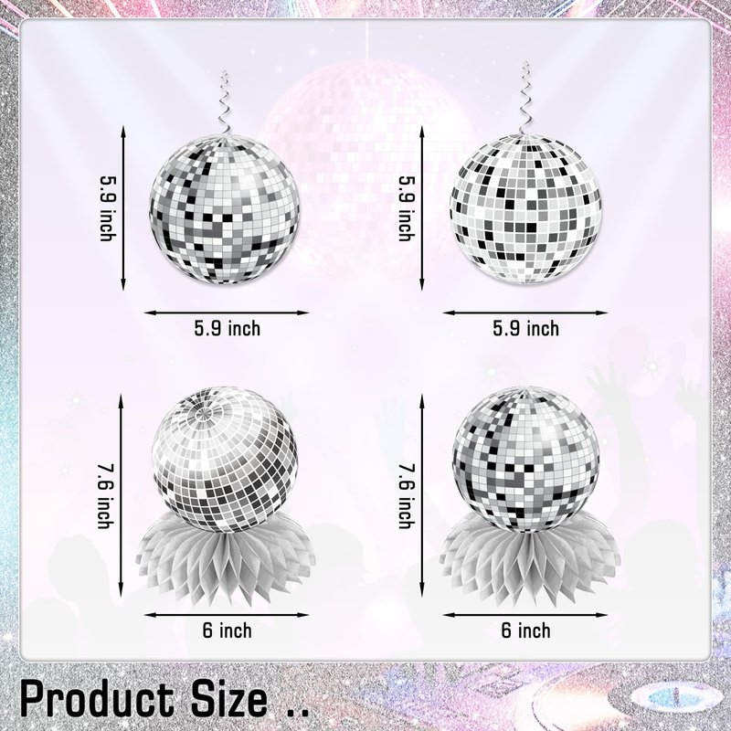 - 【Disco Disco Party Supplies】:The package includes 1pcs HAPPY BIRTHDAY banner, 9pcs silver disco ball cardstock with 9pcs silver hanging foil swirls, 5pcs honeycomb centerpieces with silver color