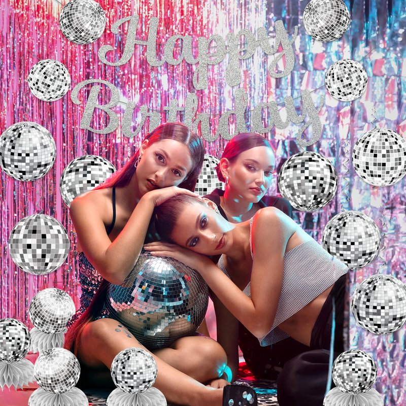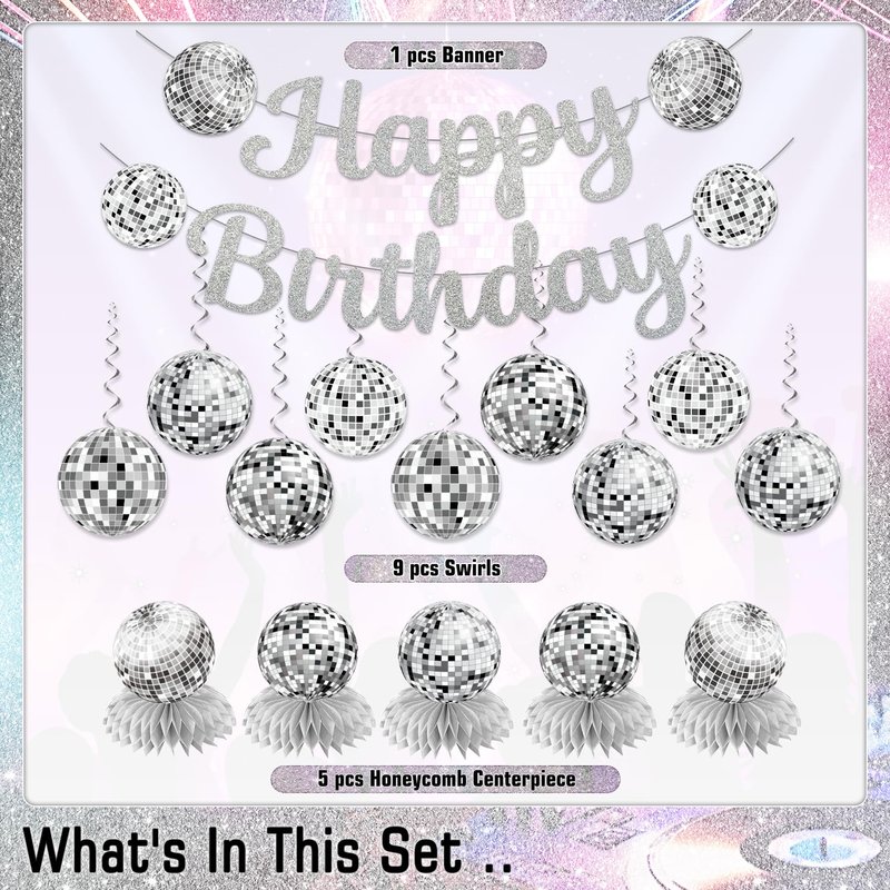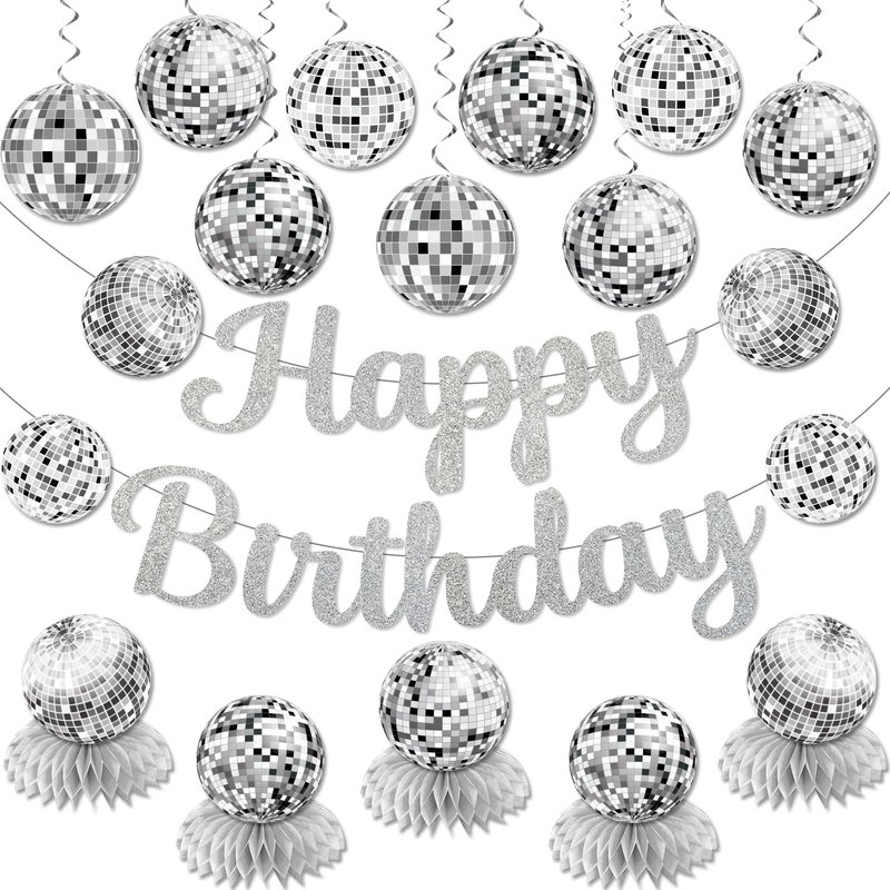 Disco Birthday Party Decorations, Disco Happy Birthday Banner Silver Disco Ball Hanging Swirls, Disco Ball Honeycomb Centerpieces, 70s 80s 90s Disco Themed Party Decorations