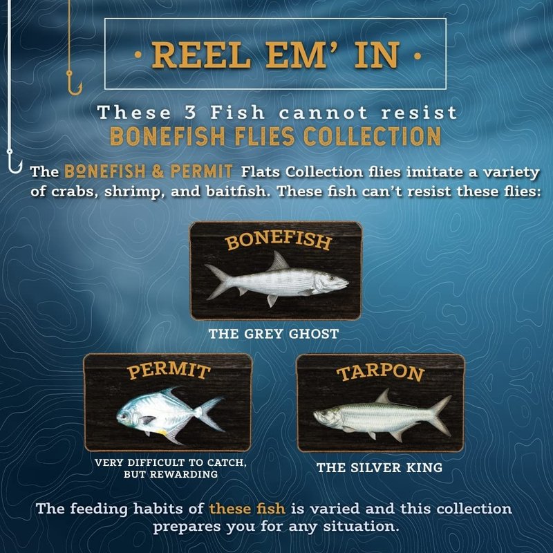- Fly Fishing Kit: Fill your fly box with the most productive assorted flies that bonefish can’t resist. Durable and effective, these fishing kits include 15 flies packed in a fly fishing box for quick and convenient access.