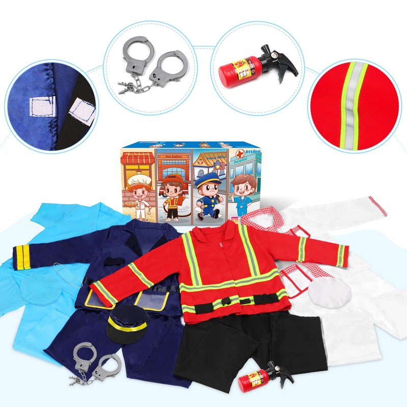 - Kids Career Role Play Costume Set: 14PCS boys dress up costumes for play in one size include policeman costumes set (1xpolice costume, 1xpants, 1xpolice role play hat, 1xhandcuff), Fireman costumes set (1xfirefighter costume, 1xpants, 1xfirefighter extinguisher), Doctor costume set(1xdoctor dress up clothes, 1xdoctor dress up pants, 1xdoctor surgery cap, 1xmask), Chef costumes set(1xchef costume, 1xpants, 1xchef hat). 4 sets kids dress up pretend role play costumes for boys girls age 3 4 5 6