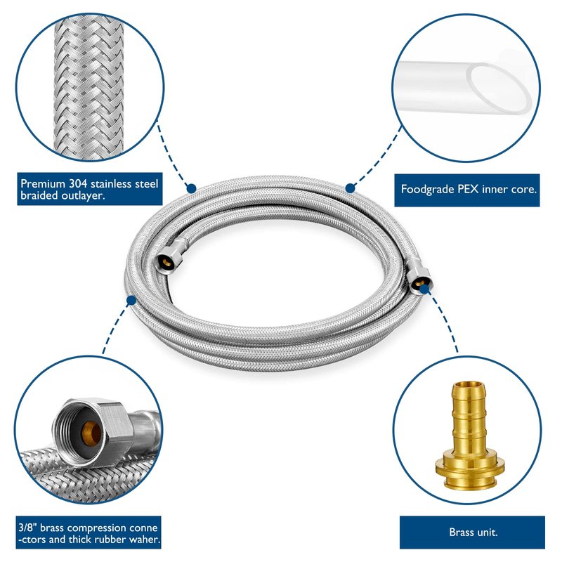 - 【Prime quality 】:The water line outer layer is wrapped with superior grade 304 stainless steel braided wire,the brass tee stop valve and elbows are single piece brass construction;So all the parts are extremely safe and durable,there is no need to consider replacement for several years.