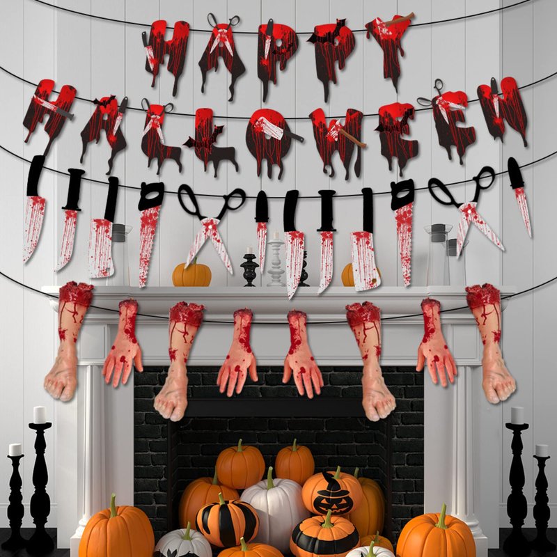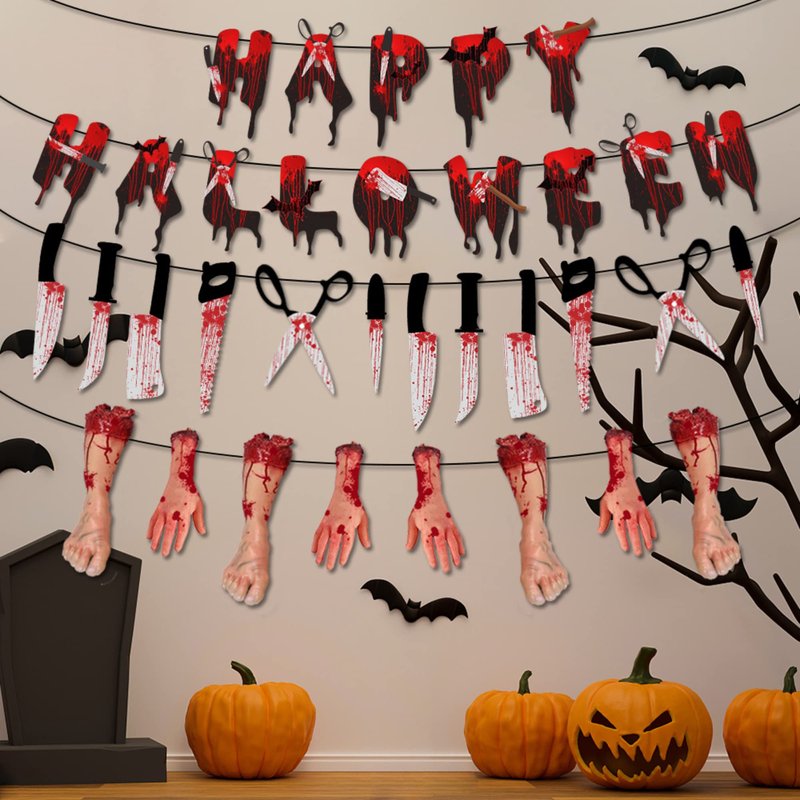 - All of the Scary Halloween Decor you need in one bag: Halloween Body Parts, Bloody Weapons Garland, Happy Halloween Banner