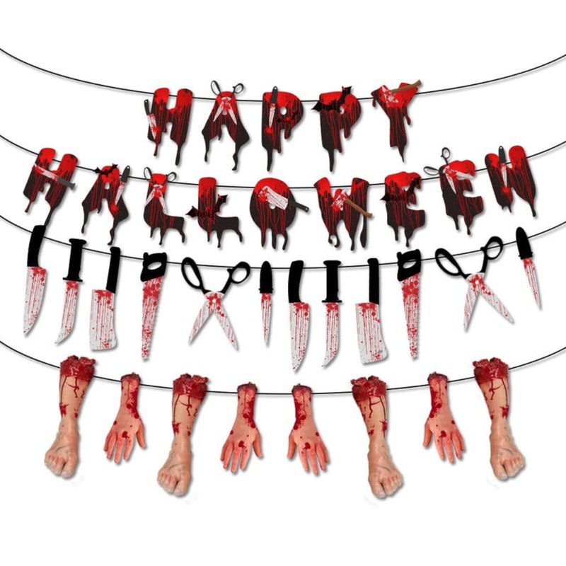 4 piece Bloody Halloween Decor including: Scary Happy Halloween banner, Bloody Weapon Garland,Fake Scary Broken Hands and Feet hanging banner - easy to hang string included for you to convert any room into a zombie party room. Halloween Camp Site Decorations