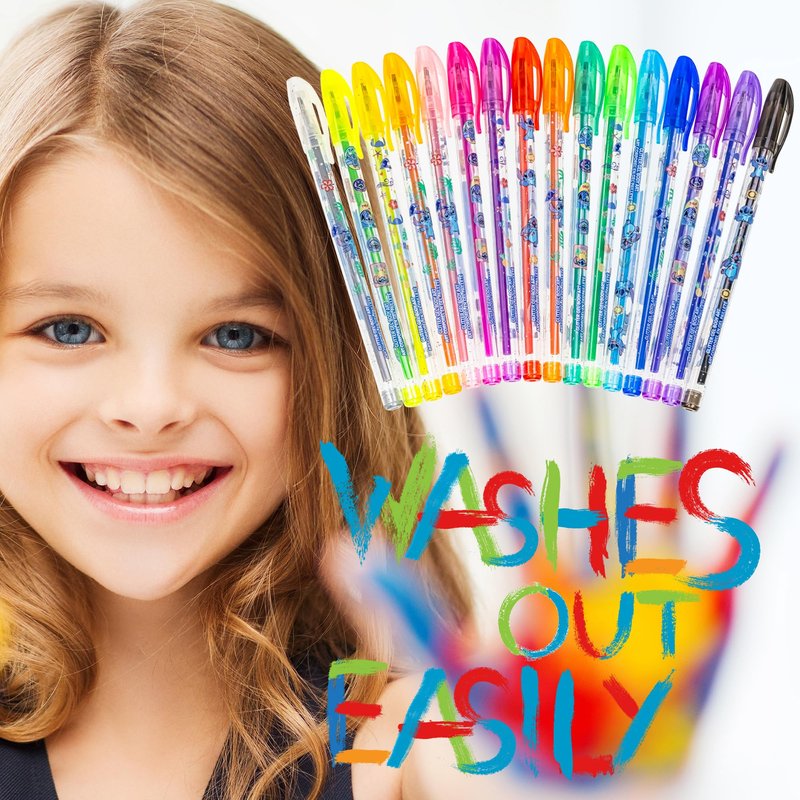 - KIT INCLUDES: 16 glitter body gel pens. Colors include various shades of pink, green, blue, red, black, gold, silver, and more. All the colors your little one needs to create a work of art!