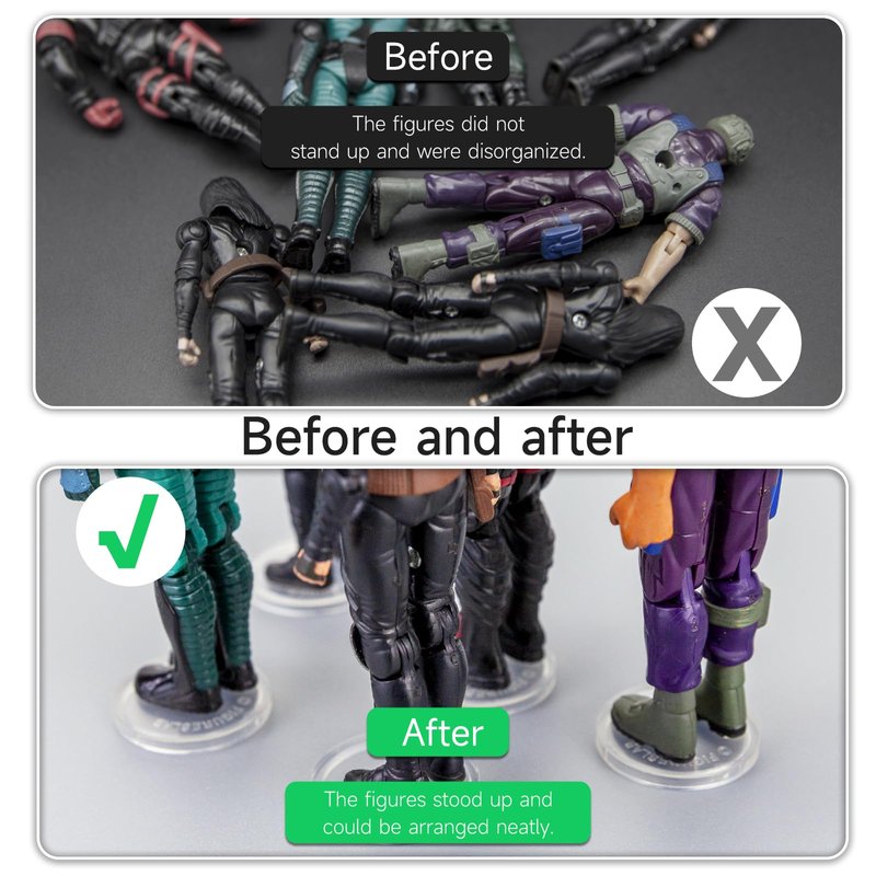 - EXCLUSIVE DESIGN: Contains 50Pcs Figure display bases,These new stands come with a peg option - we have tested them on pretty much every figure that has been released , then we are confident that the pegs will work with each figure,allowing your Figure toy two feet to perfectly fit the base for a more perfect display,you can display your favorite figures on it, because of its stability you don't have to worry about it falling down easily.