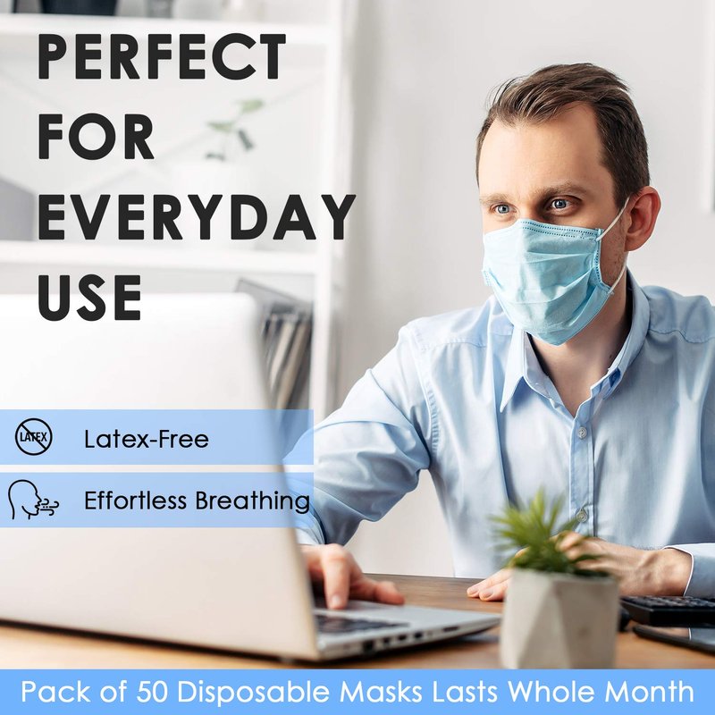 Disposable Face Mask for Men & Women (Pack of 50) - 3-Ply Facial Mouth Cover Masks - Breathable Face Protective Masks with Earloops & Adjustable Nose Clip - Disposable Masks For Adults