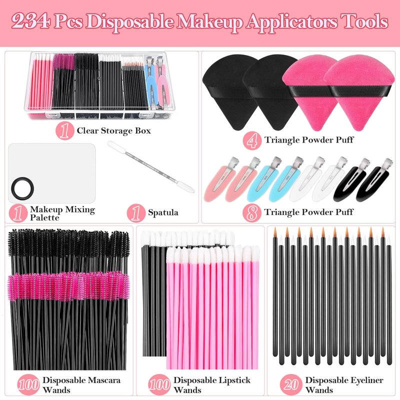The disposable makeup applicators kit makeup artist must-have supplies with 234 pieces of makeup wands applicators and tools, including mascara wands, lip applicators, powder puff, makeup mixing tray, hair clips, and all the makeup essentials disposable applicator tools for daily makeup and replacement. Disposable makeup applicators are great ideal for both professional makeup artists and home use, providing you with a hygienic and comfortable using experience for everyone keeping makeup supplies clean without waste and mixing together.