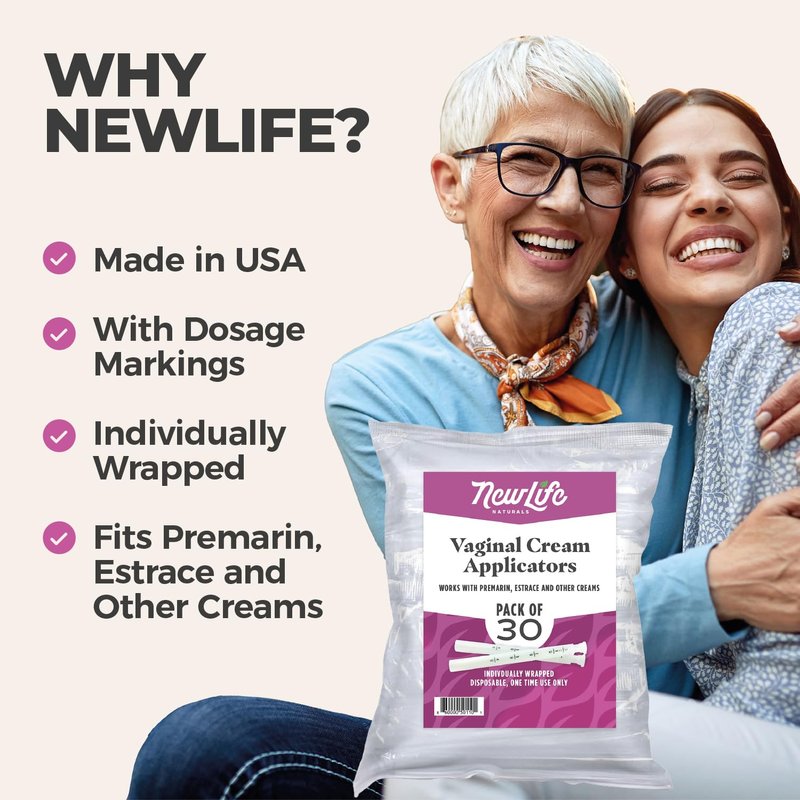 COMFORT TIP Vaginal prescription products often only come with one applicator, forcing you to wash and reuse it each day until the medication is used. NewLife Naturals has created disposable applicators to solve this problem. Designed with a rounded tip, our applicators ensure comfortable and easy insertion, making it a more hygienic solution compared to reusable applicators. Use our 30 pack of applicators with any vaginal cream, gel, or lubricant products. EASY MEASURING No more worries about whether or not you’re using the right amount of your medication. Our applicators feature easy to read dosage markings of 0.5 GM, 1 GM, 2 GM, 3 GM, and 4 GM. This allows you to quickly measure and stay on track with your next refill. INDIVIDUALLY WRAPPED For added safety and protection, each applicator in our pack is individually wrapped to keep them clean and sterile until they’re used. The plastic applicators are made in the USA and are sterilized before being wrapped and packaged in a resealable bag. The 30 pack provides the perfect number of applicators for one month of use with your prescription medication. NO WASHING Most vaginal creams and prescriptions are packaged with one applicator to use for the entire month. This means you have to wash and reuse the applicator over and over. Not only is this time consuming, it also leaves questions about whether you’ve cleaned the applicator thoroughly enough for it to be safe for reuse. Our one-time-use applicators are wrapped and sealed until you’re ready to use them, making them more hygienic than reusable alternatives. THREADED END The threaded end of our applicators fits most medication tubes, allowing you to thread the tube directly onto it and pullback the handle until the desired amount is in the applicator. Then administer the medication and throw applicator away.
