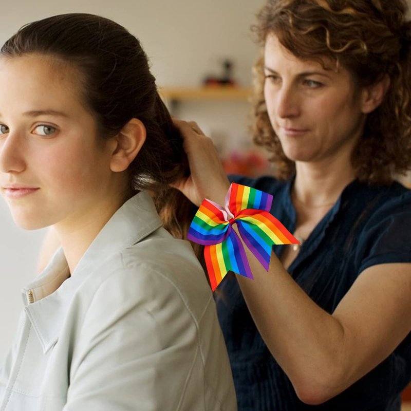 DIUEWOW Rainbow Cheer Leading Bow - 2PCS Hair Ties with Elastic Ponytail Holder Bow Hair Tie Band Hair Accessories for School Girls Women Gay Pride Day Outfit