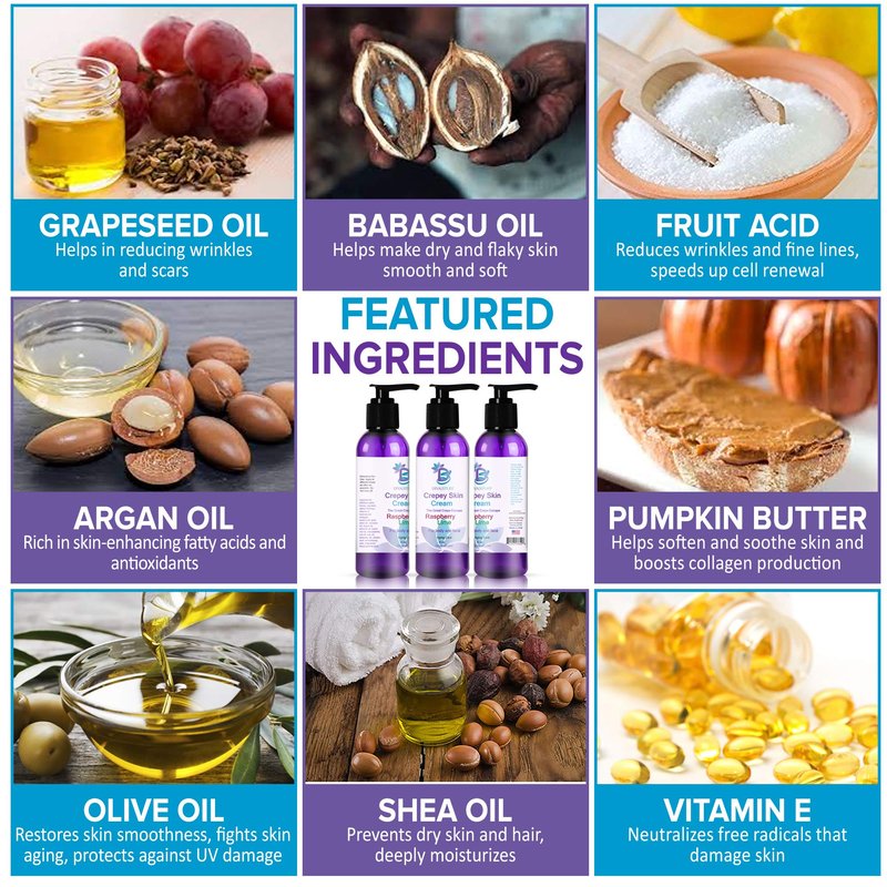 - RE-TEXTURE SKIN TO ITS YOUTHFUL GLOW: Improve skin texture, reduce wrinkles, and restore skin elasticity with our crepey skin treatment. Specifically formulated for skin that’s wrinkled like crepe paper, this anti-aging cream is blended with Hydrolyzed Collagen, Vitamin E, Olive Oil, and other ingredients known to reverse aging. Apply it as a spot treatment to your face, neck, decolletage, and other problem areas on your body. Use as often as possible and do not rinse off.