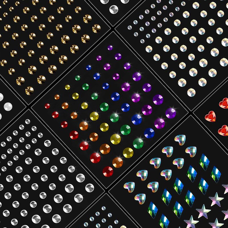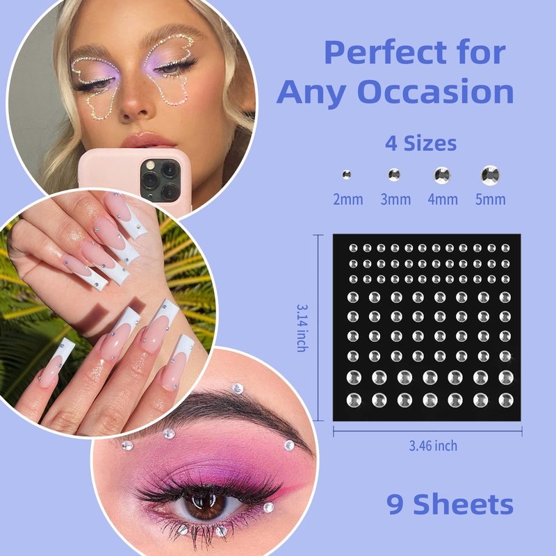 - SELF ADHESIVE & EASY TO USE: These Diamond Rhinestone Comes Pre-attached, All Are Self-adhesive. Clean And Dry Your Skin First. Then Carefully Peel off the Face Jewelry You Want From The Plastic Sheet With Tweezers Especially The Smaller Ones. And Put Face Gems on Final Finished Makeup so the Face Jewels Stick on Face Firmly.Kindly Suggest to Use Eyelash Glue to Enhance the Stickiness, Especially Oily Or Sweating Skin.