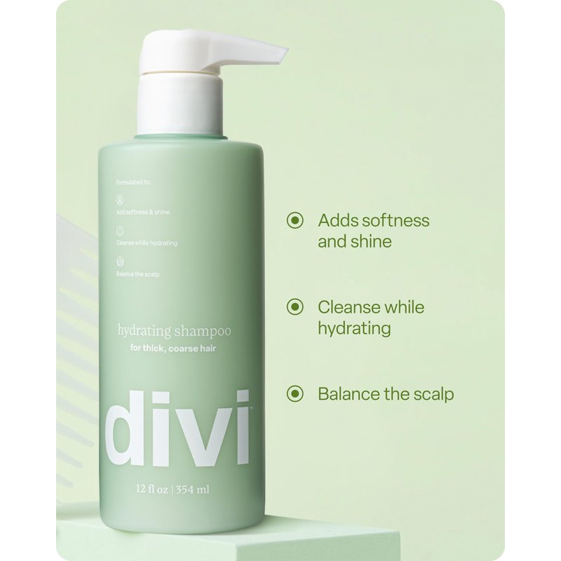 Elevate your wash days with Divi’s new Hydrating Shampoo, designed to deliver rich, luxurious hydration without extra weight or residue. This moisturizing formula cleanses while balancing the scalp to create the best conditions for your hair to thrive. Algae Extract, Tea Tree Oil, and a Blend of Postbiotics, Green Tea, and Yuca-Derived Glucosamine, blend to create a tingly, invigorating experience while delivering deep nourishment.