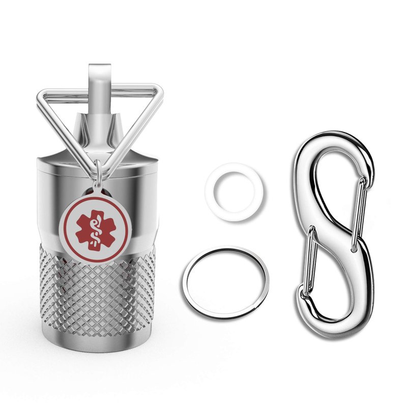 - 👍ENTIRELY PRECISION MACHINED & PATENT PENDING: single chamber from solid surgical stainless profile bar, feature dual carabineer clips, comes standard with a 23mm (micro, small & medium) or 30-mm (large) flat stainless-steel split ring. Your pills go with your house / car keys all the time so that you will never leave them behind.