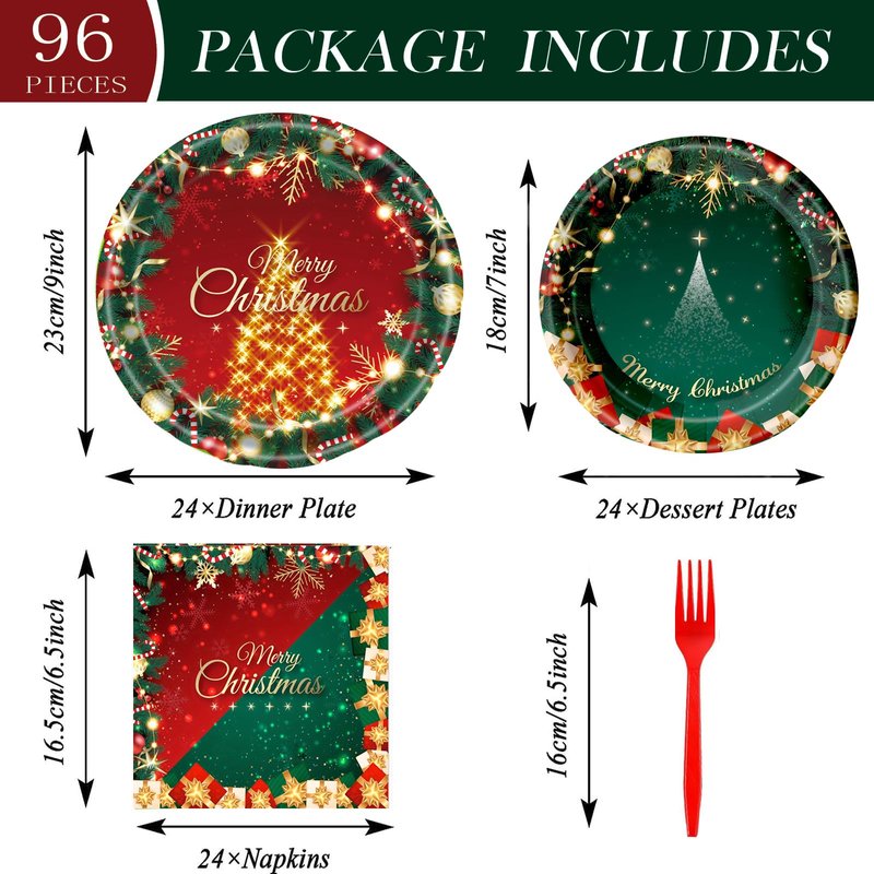 - Christmas Party Supplies Serves 24: This Christmas party supplies set including 24 plates (9inch), 24 plates (7inch), 24 napkins (6.5inch) and 24 Forks, Serves 24 guests, the sufficient quantity to meet your party use and replacement needs.