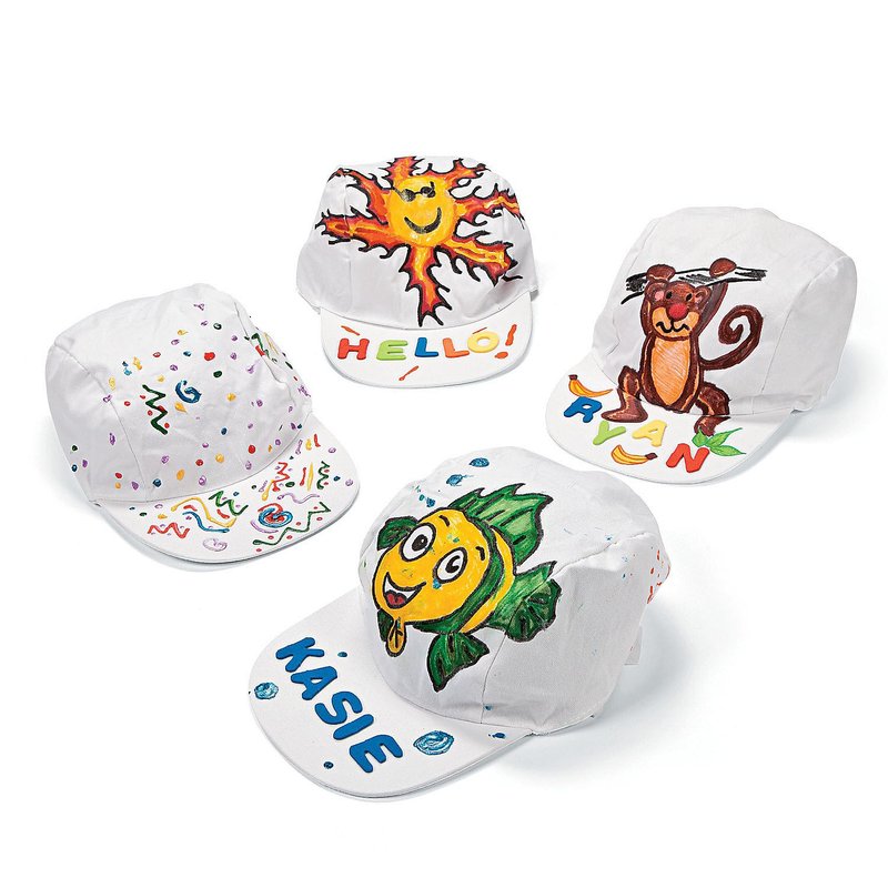 Unleash your inner daredevil by drawing up your own adventure hat. This activity kit is the perfect DIY project for artists and explorers. Wear your wildly fashionable cap on safari hikes family vacations and while attending ball games. Safe and non-toxic. Conforms to ASTM D-4236. Assortment may vary. 22 circ. Includes: 12 cotton baseball caps 30 fabric paint pens 8 fabric markers 250 foam letter stickers