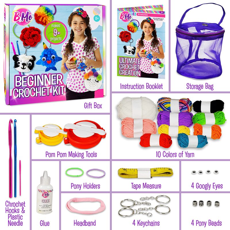 DIY All in One Crochet Knitting Kit for Beginners Starter Arts & Craft Set for Kids Teens Tweens & Adults – How to Learn Make Your Own Yarn Pom Poms – Birthday Gift for Kids Ages 8+