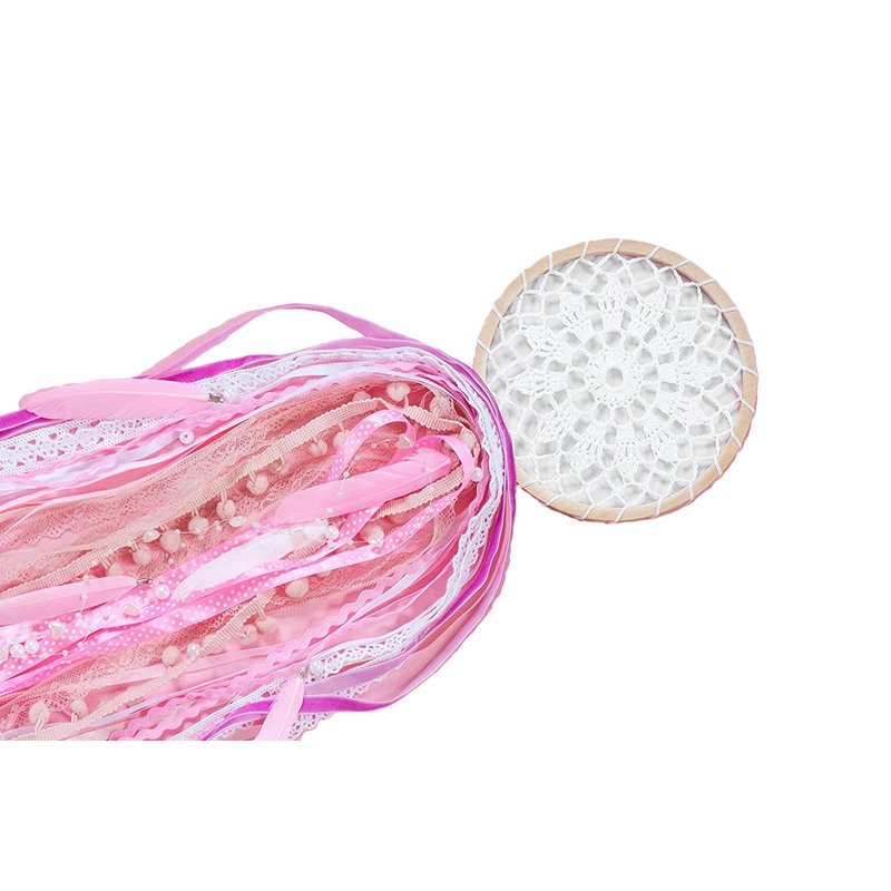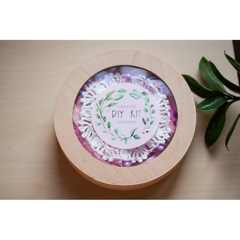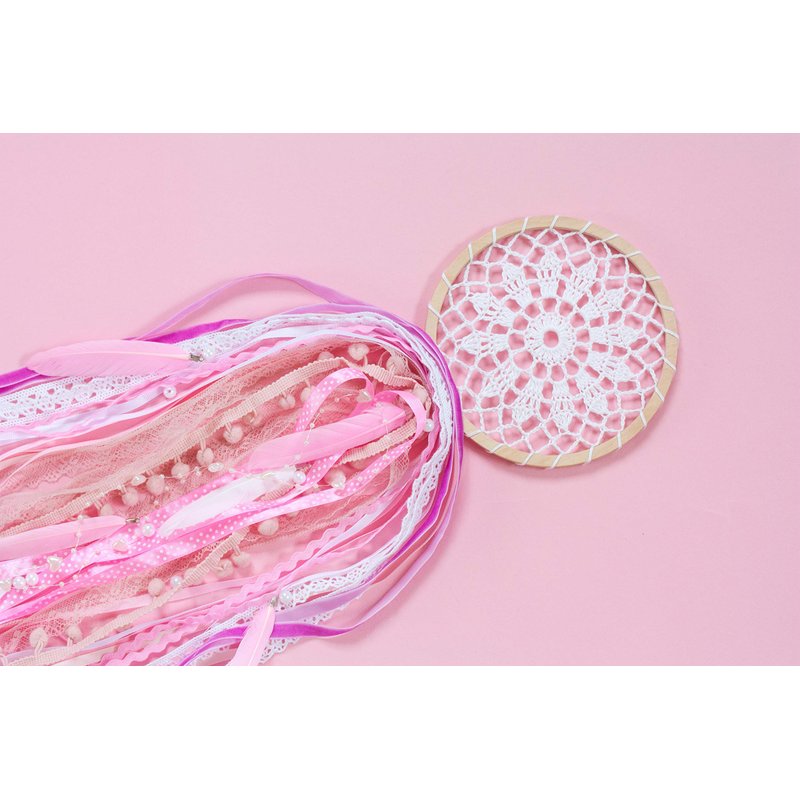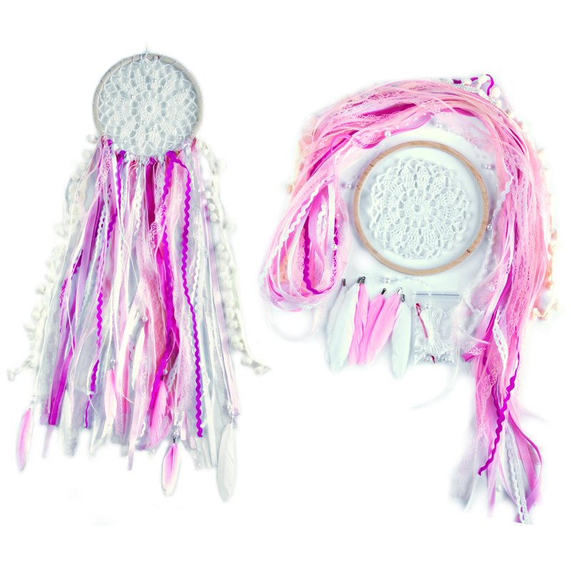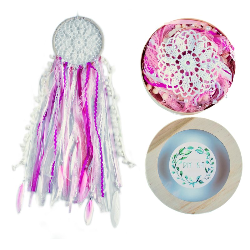 The Do it Yourself kit includes all for the making dream catcher with hanging lace, feathers and crochet doily in the center. The main colors of the kit are pink, white, purple and blush
