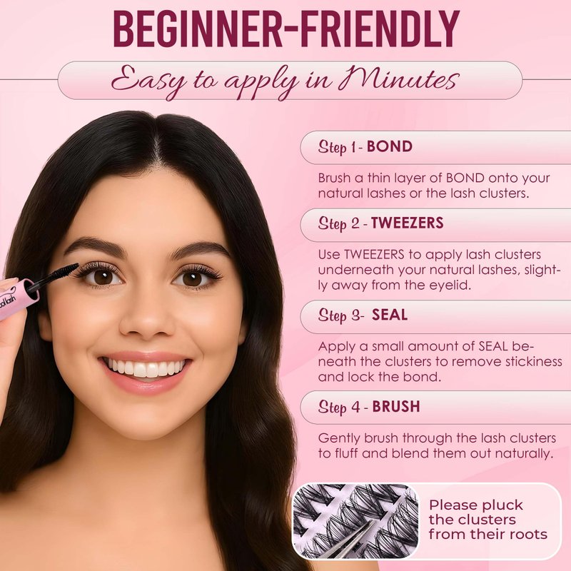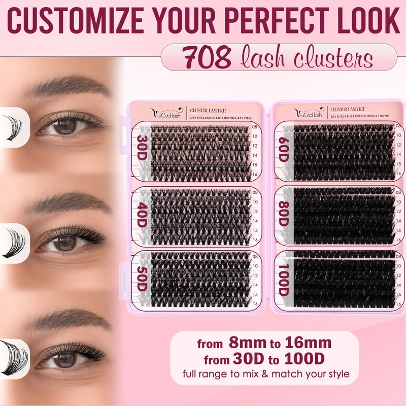 DIY Lash Clusters Kit 708 PCS – D Curl Wispy Eyelash Extensions 8–16mm with Bond & Seal Glue, Tweezers, Pads & Brush | Beginner Friendly Individual Cluster Lashes (30D, 40D, 50D, 60D, 80D, 100D)