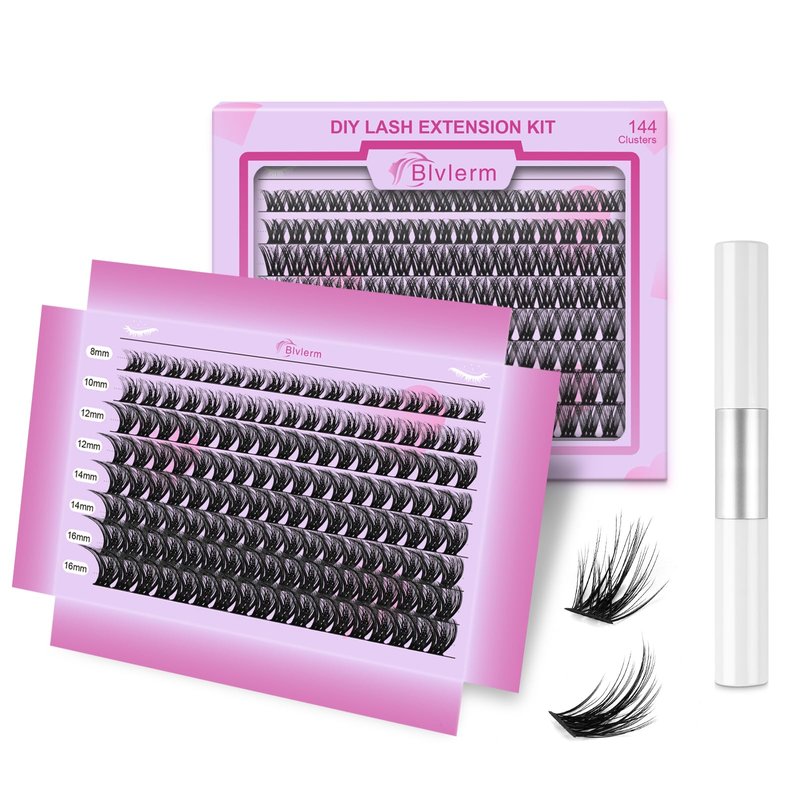 DIY Lash Extension Kit 144pcs Cluster Lashes Individual Eyelash Extension with Super Thin Band 8-16mm Mixed Tray D Curl Soft Fluffy False Eyelashes Natural Look with Glue for Self Application at Home