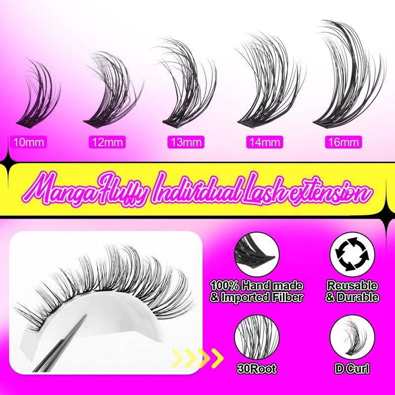 - Premium Eyelash Clusters - Our lashes are 100% handmade, made from premium fibers, harmless, soft and comfortable, just like real eyelashes. 10-16MM manga fluffy lash clusters can be combined into manga eyes, cat eyes, round eyes. You can match different eyelashes styles according to your preferences.