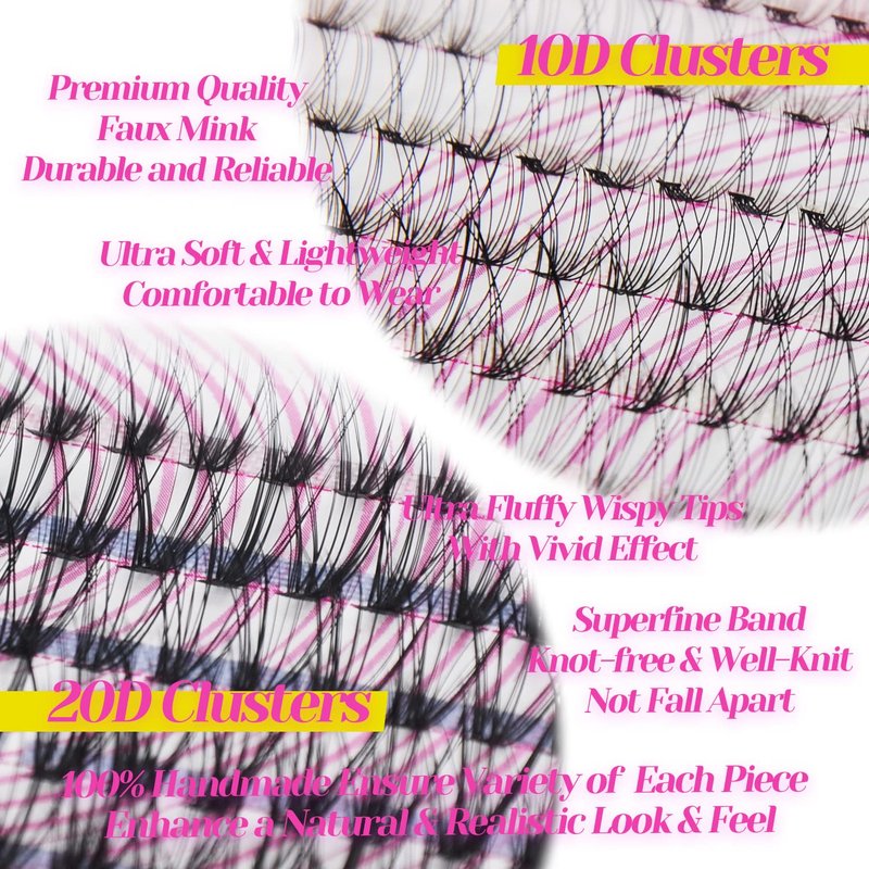 - Premium Quality Cluster Lashes: DIY cluster eyelashes are made from the finest quality, cruelty-free materials and are soft, lightweight, wispy, natural, fluffy, vegan, knot-free, and matte dark. The specially formulated lash glue is strong hold, fast-drying, waterproof, and long-lasting.