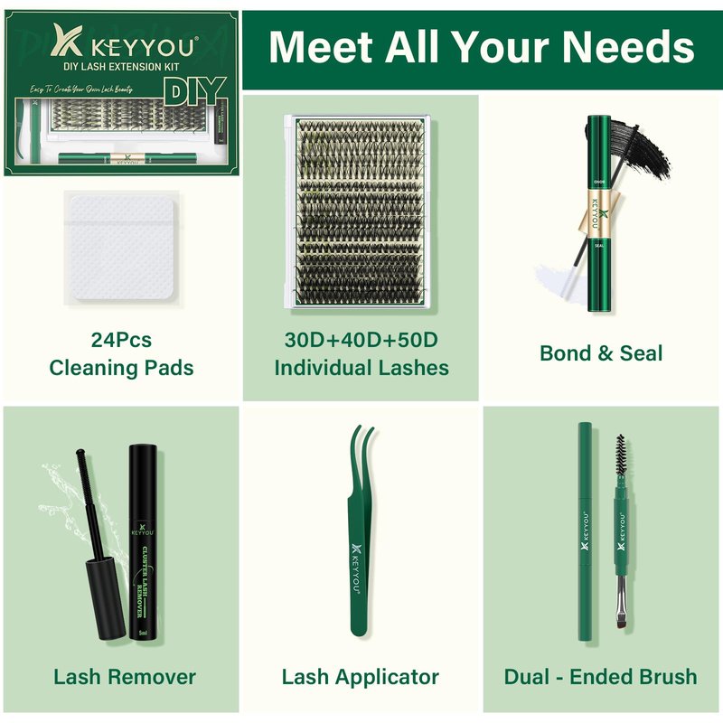 - 【What It Includes】KEYYOU DIY lash extension kit comes with 300pcs high quality lash clusters,10ML Lash bond and seal,10ML lash remover,one lash applicator,one lash brush and 20pcs cleaning pads to meet all your needs.