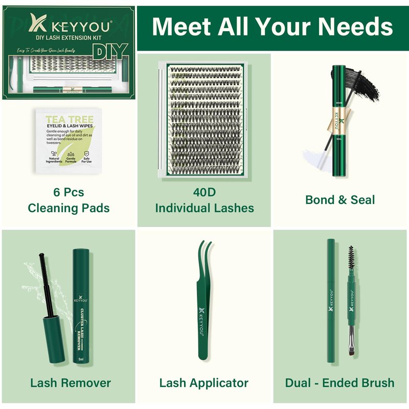 - What It Includes:KEYYOU DIY lash extension kit comes with 300pcs high quality lash clusters,10ML Lash bond and seal,10ML lash remover,one lash applicator,one lash brush and 20pcs cleaning pads to meet all your needs.