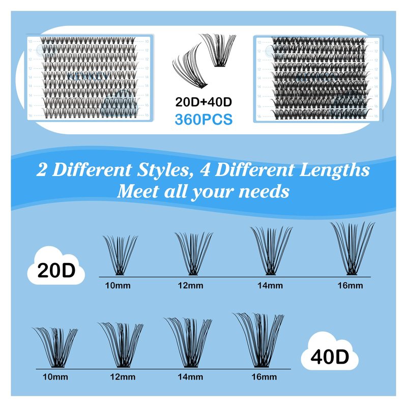 - Comfortable and Beauty Lash Clusters: KevKev DIY lash extensions kit include 360pcs 30D+50D cluster lashes in 4 different lengths(10-16mm mix), the eyelash clusters providing a comfortable and lightweight wearing experience.