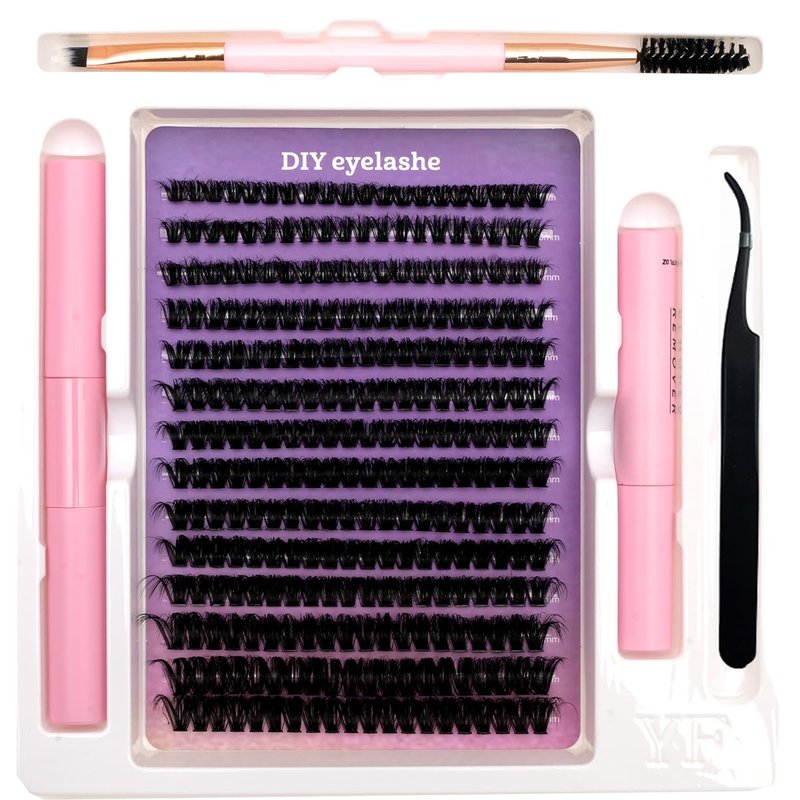 - 1.The kit includes: 1 tray of clustered eyelashes, 1 eyelash adhesive, 1 pair of eyelash application tweezers, a dual head brush, and a makeup remover. Our DIY eyelash kit includes all necessary tools.