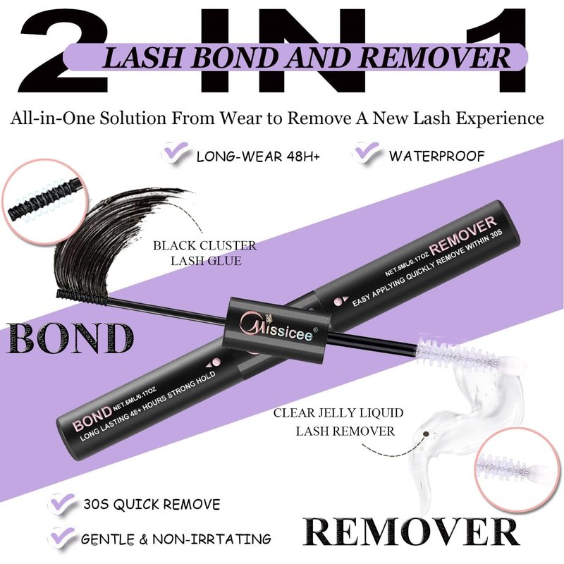 - 【Easy to Wear & Remove】Missicee use safe materials for lash bond and lash glue remover. The eyelash bond is no irritation, waterproof and can last a long time for 48 hours. The lash remover for lash extensions can achieve 30s fast removal with no residue. 2 IN 1 cluster lash glue and remover make it a convenient all-in-one solution for your lash extension needs.