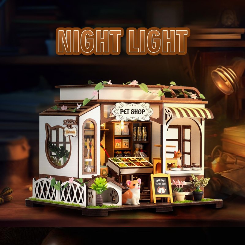 DIY Miniature House Kit,Pet Shop Dollhouse with Furniture & LED,Adults Teens Mini House Building Kit,3D Wooden Crafts Tiny House Model,Xmas New Year Birthday Gifts Home Table Decor,Fun for Self Time