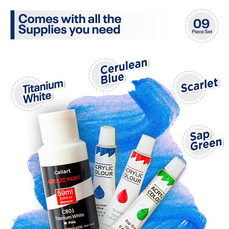 - Comprehensive 9-Piece Acrylic Painting Kit: Our painting kit includes all the materials needed to bring your creativity to life. High-quality acrylic paints, a durable paint palette, a set of brushes, graphite paper, and a canvas panel. Use the exact same materials as the instructor for a seamless, enjoyable painting experience from start to finish.