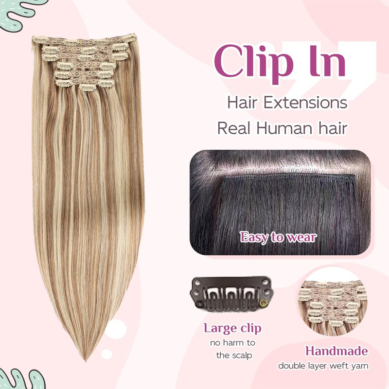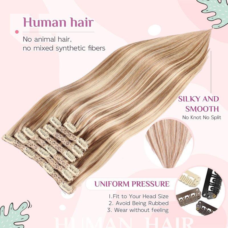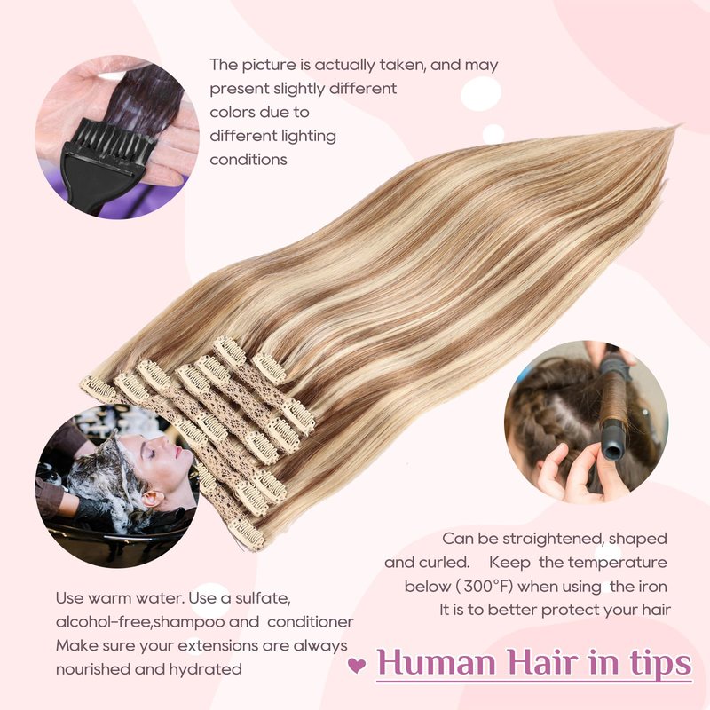 - 【Salon Quality - Human Hair Clip In Extensions】100% human hair clip in extensions from healthy girls,pure handmade,tangle-free,shed-free,without any mixed materials for hair extensions real human hair.Soft,Smooth and Comfortable!Can be straightend/curled/dyed or styled as you wish.Due to differences in lighting intensity, shooting angle, and display equipment,We display the most accurate colors possible. Human Hair Extensions Clip Ins.Hair Extensions Real Human Hair.