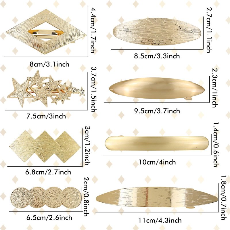 - Versatile Sizes: The hair clips come in a pack of 8 pieces, featuring different designs such as stars, lozenges, rounds, and ovals. The lengths of the clips range from 6.5cm/2.6" to 11cm/4.3", making them suitable for women and girls with all hair types, whether it's thin or thick.