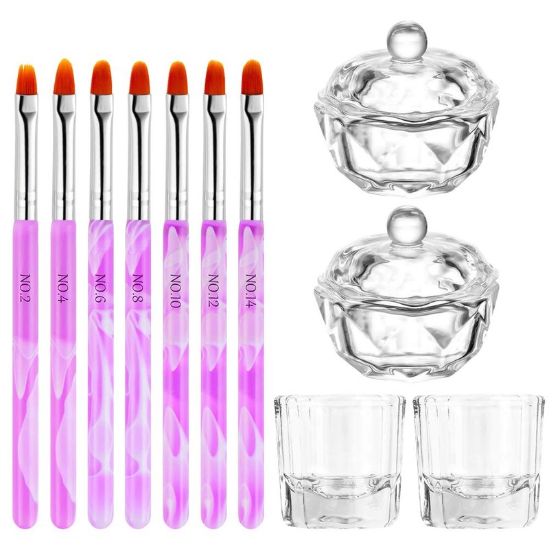 DKAF 11Pcs Nail Art Tools, 4 Nail Art Acrylic Glass Bowl Dappen Dishes Cup and 7 Acrylic Nail Brush, Crystal Cup UV Gel DIY Brush Set for Acrylic Liquid Powder Styling Tool