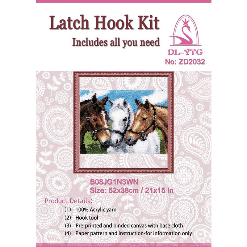 DL-YTG Latch Hook Kits Rug Three Horses Crochet Yarn Cushion Colour Pre-Printed Canvas Cover Rug Needlework DIY Hook and Latch Kit Home Decoration 52x38cm/20 X15 inch