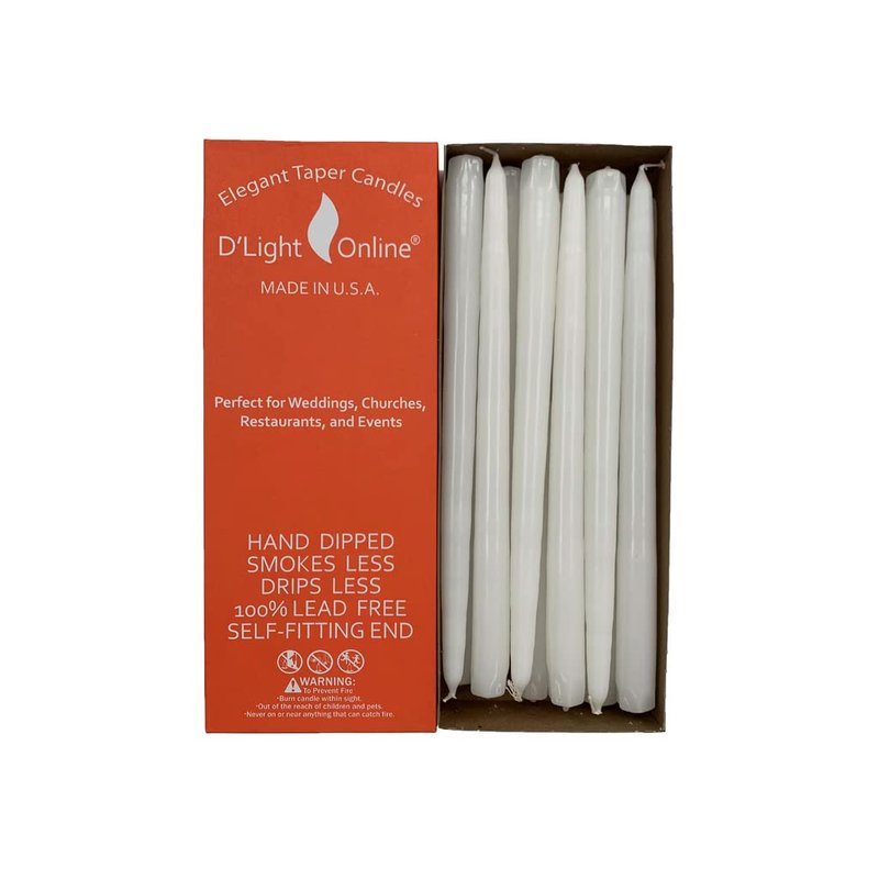 D'light Online White Taper Candles, 10 Inch Premium Quality Candles Hand-Dipped Tapered Candles, Dripless, Smokeless and Unwrapped Bulk Pack for Events - Set of 12 (10 Inch, White)