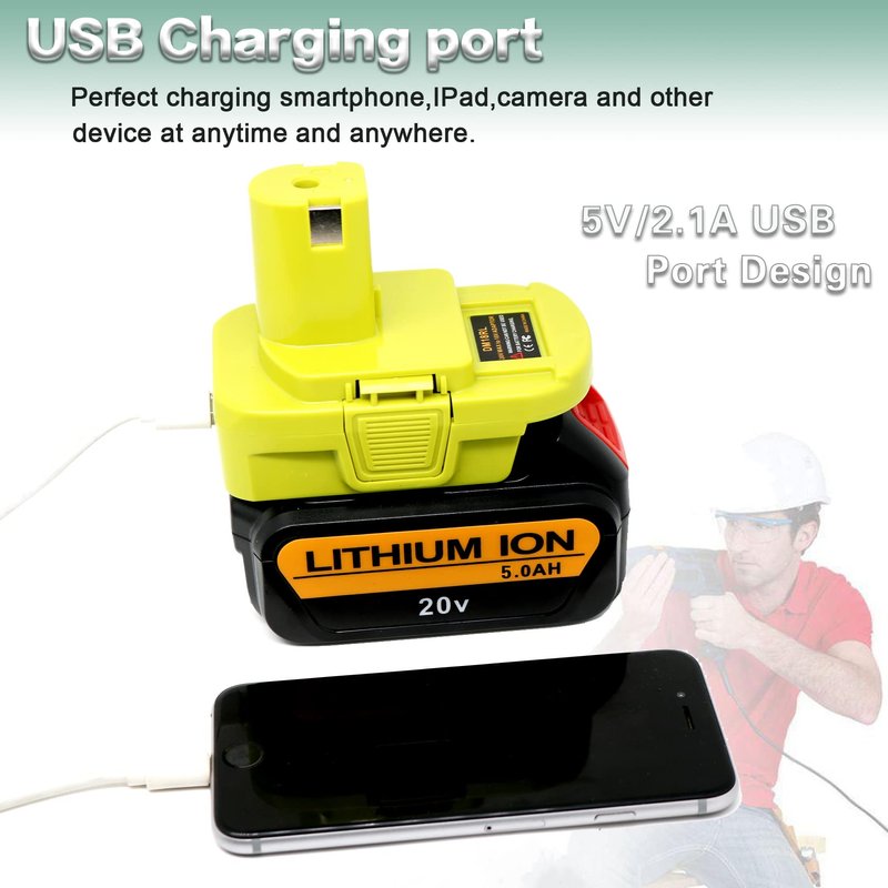 - This DM18RL adapter Built-in 5V 2.1A (Max) USB Charging Function. Designed for compatibility with Ryobi ONE+ 18V cordless power tools, replacement for Ryobi 18V Battery P102 P107 P108 P100 P103 P104 P105 battery.