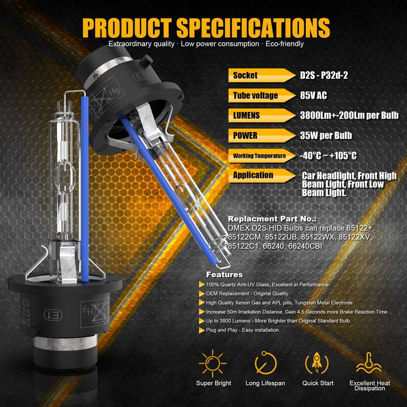 Replacment Part No.: DMEX D2S HID Bulbs can replace 85122+, 85122CM, 85122UB, 85122WX, 85122XV, 85122C1, 66240, 66240CBI.