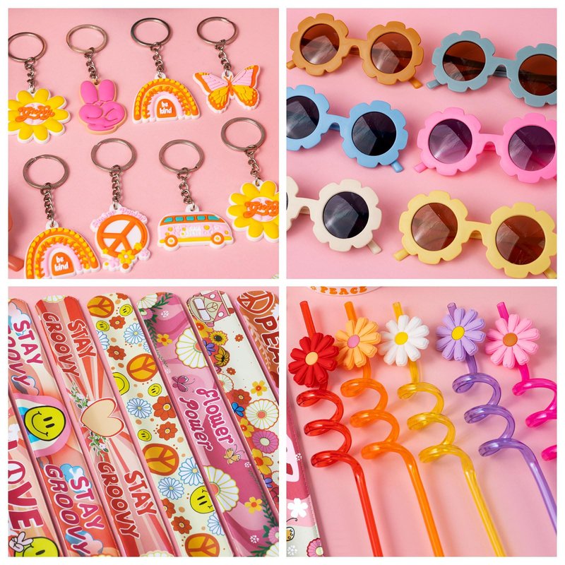 - Groovy Party Favors: 120 pieces including bus boxes, retro flower sunglasses, temporary tattoos, slap bracelets, keychains, plastic straws, and silicone bracelets.
