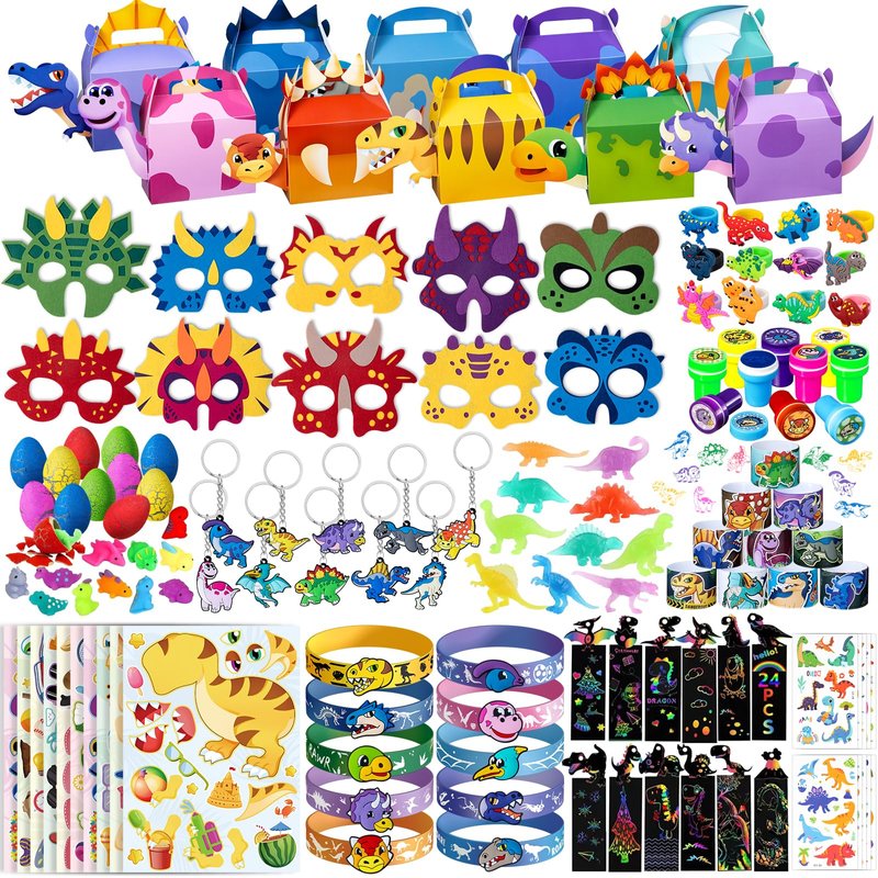 - BEST GIFT FOR THE KIDS: Just one set is enough for the whole jungle dinosaur birthday party favors,include 10 Gift Boxes,10 mask,10 Slap Bracelets,10 Silicone Wristbands, 10 bookmarks, 10 stamps, 10 Keychains, 10 DIY stickers, 10 rings, 12 PCS Dinosaur Eggs Toys, 10 PCS Dinosaur Tattoo Sticker, 10 Glow in the Dark Dinosaur, Best for Fill Up the Birthday Gift Bags.