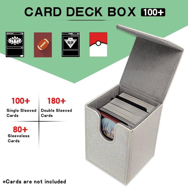 The vertical commander deck box come with 4 ones as a set. They are made of laser PU leather, each one comes with 2 dividers. Each one holds up to 100+ Standard size gaming cards with single sleeves or 180+ sleeveless cards. Fits all standard size trading cards such as football cards, baseball cards, poker cards, game cards, attack cards. Compatible with Magic the Gathering and other standard size card games, YuGiOh! and many more CCG, LCG and all your favorite TCG card games.