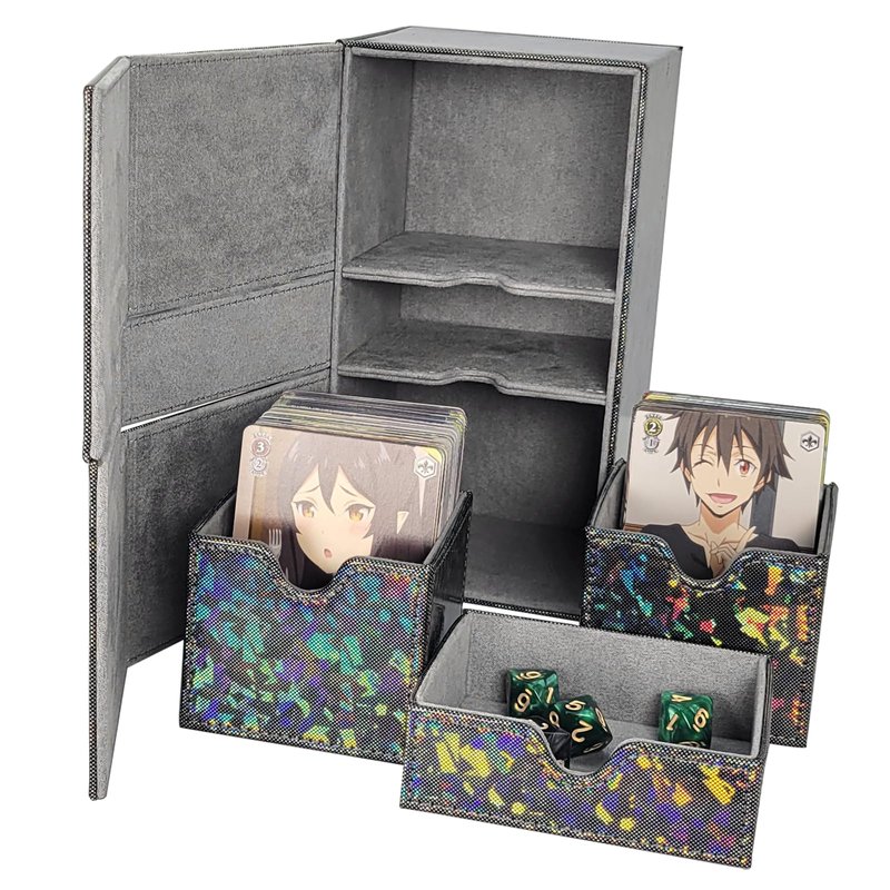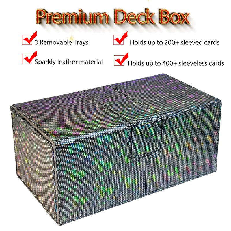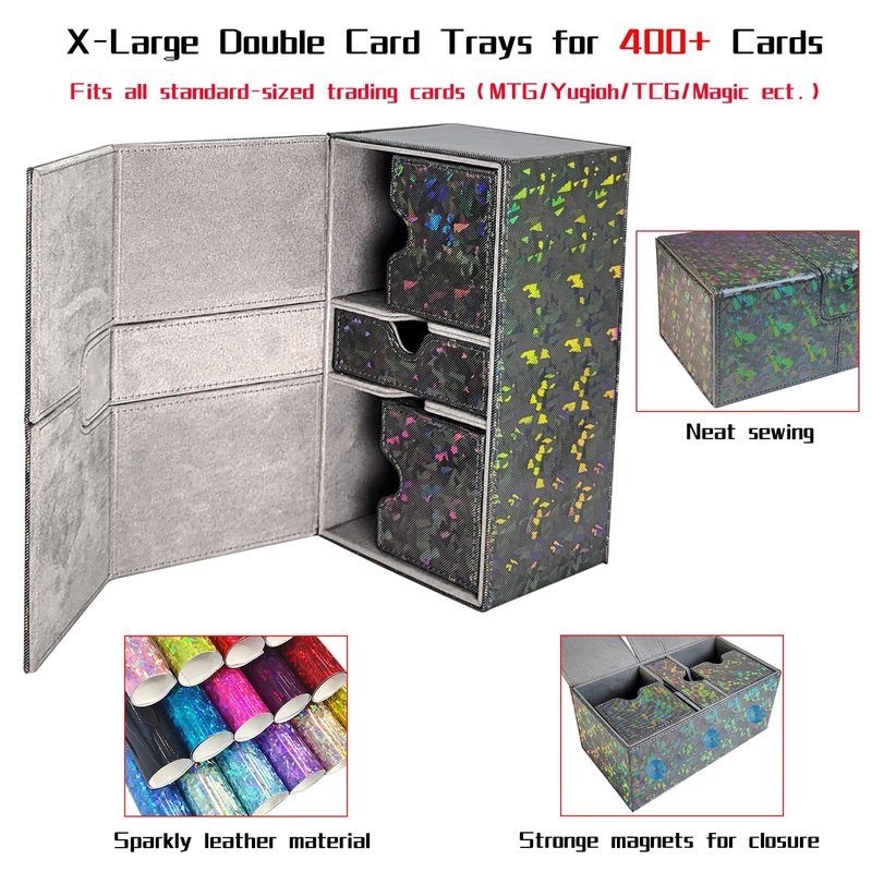 The sparkly card deck box comes with a dice tray and two card drawers. Can hold 200 single-sleeved cards, about 100 double-sleeved cards and about 400 sleeveless cards.Compatible with Magic the Gathering and other standard size card games, YuGiOh! and many more CCG, LCG and all your favorite TCG card games.