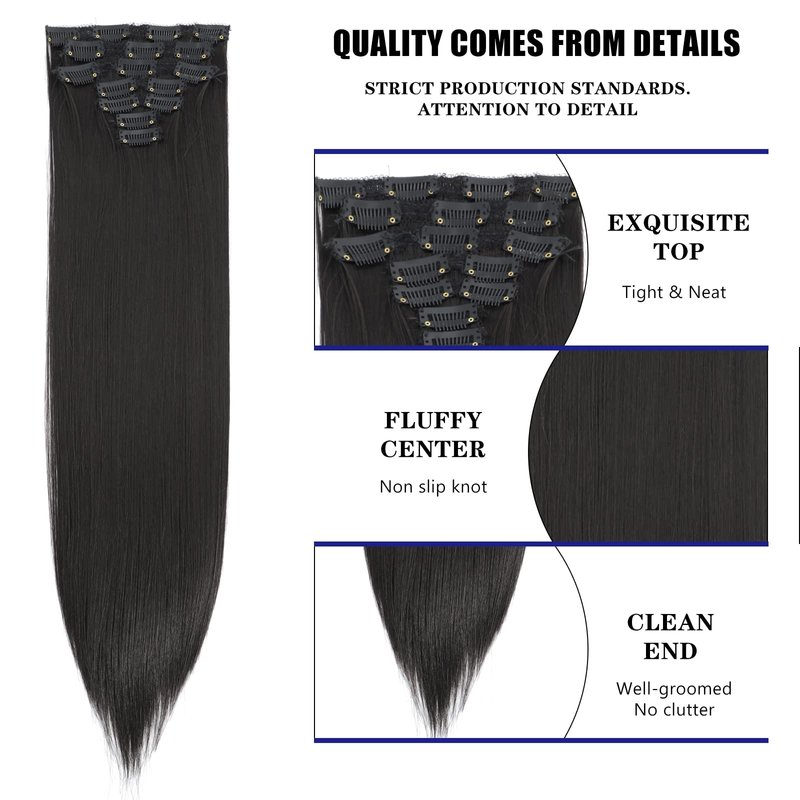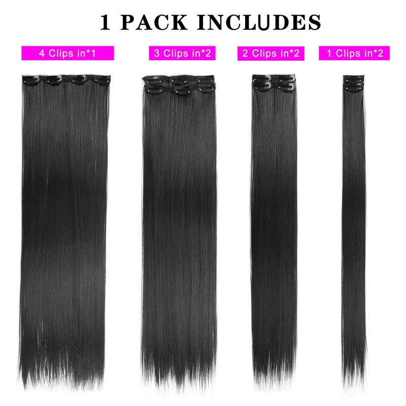 Clip in Hair Extensions for Add Volume and Length of Hair Hair Type: Clip in Hair Extensions Hair Materials: Heat resistant synthetic fiber Hair Length: 24 Inch Hair Net Weight: Approx.130g Hair Texture: Straight, Thick from Top to End Hair Set: 4 clips x 1pcs, 3 clips x 2pcs, 2 clips x 2 pcs, 1 clips x 2pcs How To Wash 1. Comb your hair with a wide-tooth comb. 2. Wash your hair extensions with warm water and sulfate free conditioner. 3. Wash your hair by holding gently. Do not rub your hair. 4. Comb your hair extensions with a wide-tooth comb from the bottom to the top of the hair extensions. 5. Gently hold the hair with your hand and squeeze the water. 6. Beat the hair with a towel until the hair is dry. Kindly Reminder: Please do not use colored shampoos (such as purple shampoo), to wash very light colored hair extensions. Because this may stain the hair extensions. How To Care 1. Wash your extensions with moisturizing hair care products. This will keep the moisture in from shampooing while at the same time not drying them out from over-shampooing. 2. Be Extremely Gentle. Combing or styling the extensions gently can let the hair not falling out. Use a wide-tooth comb, start at the bottom and slowly work your way up. 3. Deep Condition. Once a week, carefully put your extensions in warm water and apply a bit of conditioner all over. Leave for around 20 minutes then rinse it. 4. Keep Ends Trimmed. Not letting the injurie move up the hair shaft, trim the ends every 6 to 10 weeks.