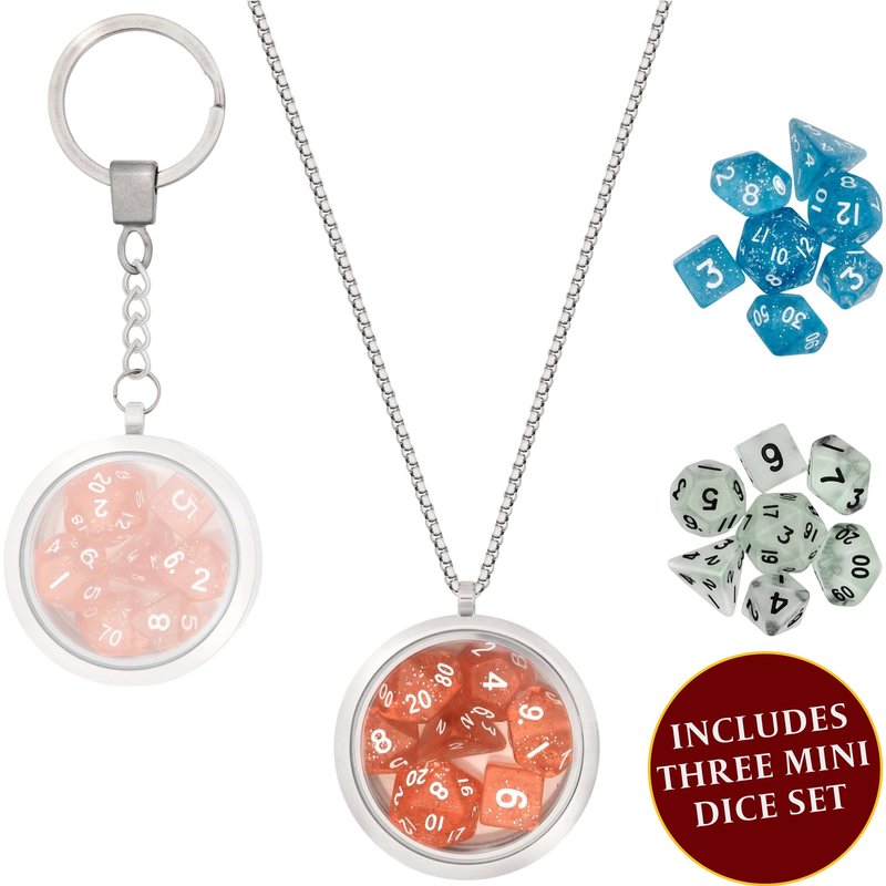 - INCLUDES: Three 14mm mini dice sets, one stainless steel dice locket with tempered glass, one stainless steel chain & one keychain. All in a nice giftable box.