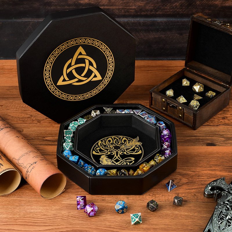 *Not Your Average Dice Tray* Soar Forge DND Dice Trays are uniquely designed with a focus on quality, style and helping to make RPG gameplay more immersive. This luxurious dice tray is made to the highest standard using premium materials and one of a kind artwork. You'll be sure to get compliments from your friends at the table. The Ancient-Empire Gold Celtic Trinity Knot (Triquetra) design printed on a high-quality black PU Leather lid is detailed, elegant and eye catching. And the sturdy, spacious and soft-lined padding will protect your dice and the noise reduction technology feels (and sounds) like you're rolling on a casino game table. Masterfully crafted for RPG gaming, there's plenty of roll room and the high padded walls let you roll more energetically compared to other trays so you don't have to worry about scratching your table or dice bouncing out on to the floor. *Storage* Have peace of mind knowing that your precious dice will be kept safely protected during transport with secure inner padding in the dice container so they won't be scratched or tarnished. *Universal Usage* They can be used for many RPG adventures like DnD, MTG, and more and are the perfect gift for gaming enthusiasts and dice goblins. *Soar Forge Lifetime Promise* Our trays are carefully inspected to help ensure consistently high quality. However, if there are any issues with this tray, there is a Soar Forge Satisfaction Promise that means we will do everything we can to help fix it, including refunds or replacements. Take your gaming up a notch and create lasting memories with family and friends with this awesome and unique dice tray for rolling. (*Dice NOT included)
