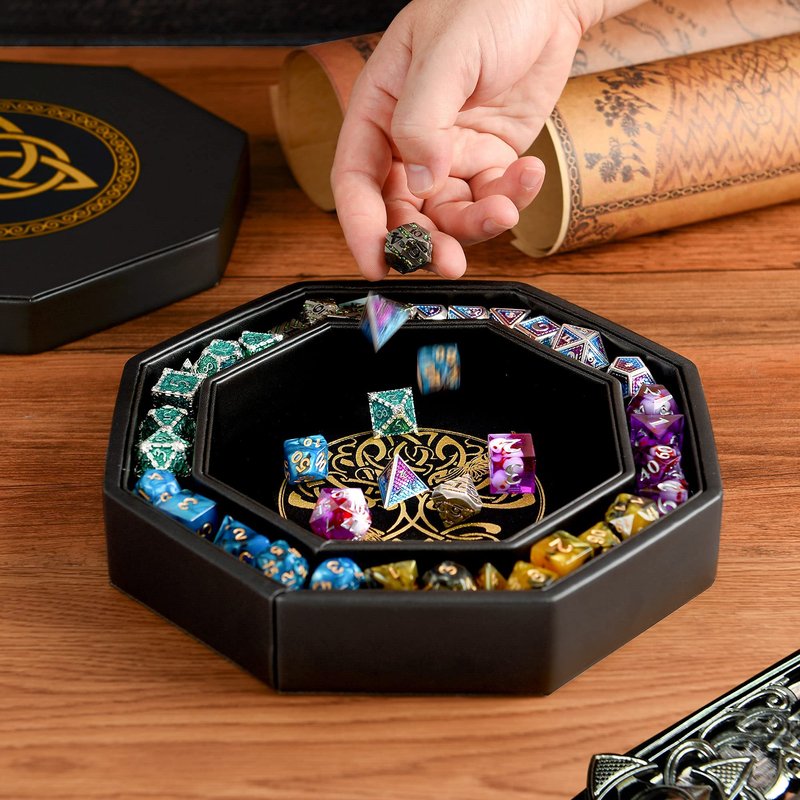 - Hold, Store and Transport a Dice Treasure Trove: The staging area comfortably fits 5 regular-sized sets of polyhedral dice in a super accessible location. Total dice tray for d&d storage including the inner-area is around 125 regular dice. Keep your favorites visible and within reach, without having to dig through a dice bag. The lid is secure and felt lined making it perfect for dice transport and storage after a game